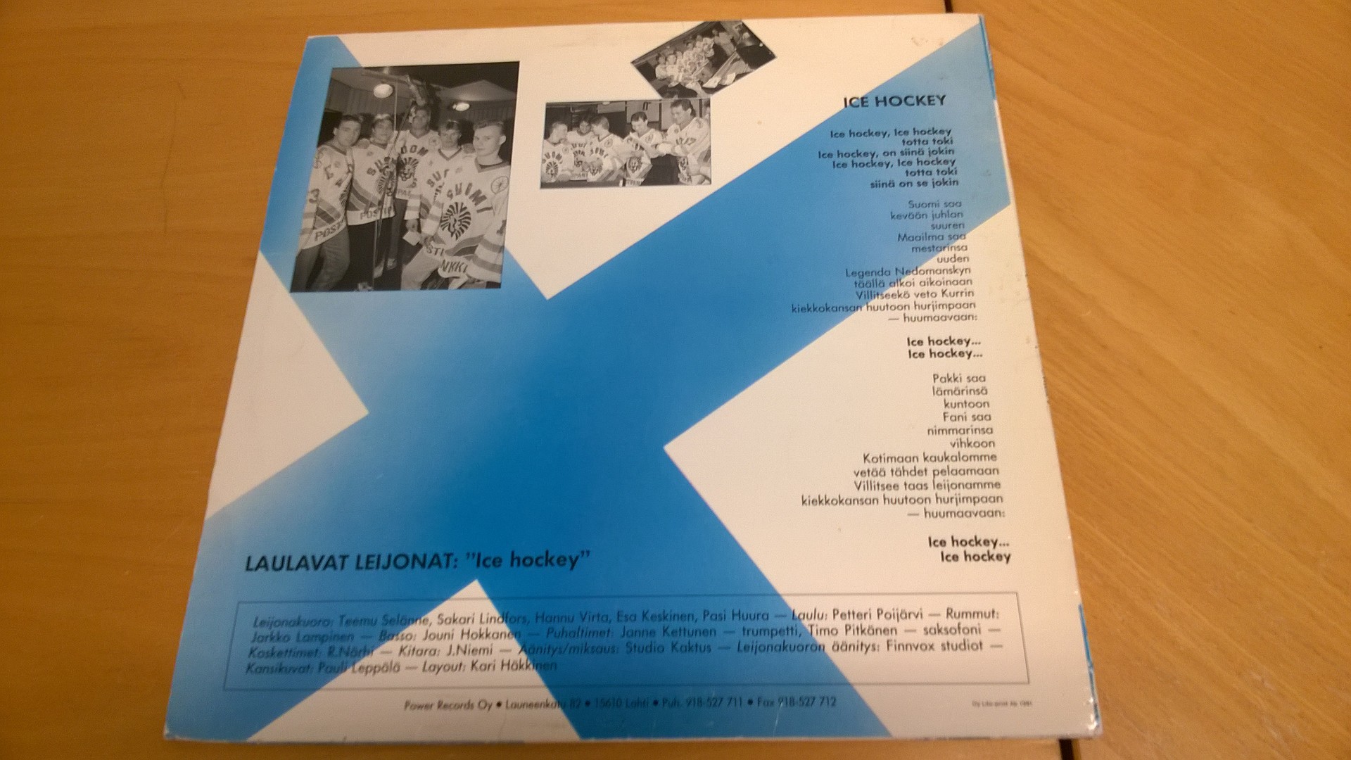 Dagens alster, som jag ropade in på Huuto förra veckan, är 12″ LP-singeln Ice hockey (eller Icehockey båda stavningssätten används på omslaget) som gavs ut av Laulavat Leijonat inför hemma-VM i Åbo, Tammerfors och Helsingfors våren 1991. Splitternya Typhoon-arenan i Åbo var huvudarenan.