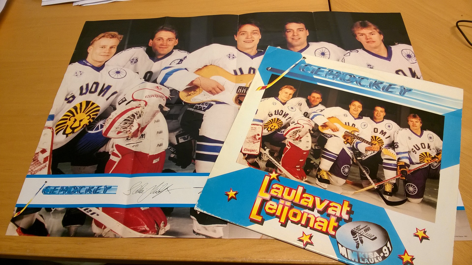 I Kiekkokansa-boken skrev jag lite på finska om “Laulavat Leijonats” låt Ice hockey. Idag fick jag äntligen tag på en helt egen kopia av LP-skivan inklusive den tillhörande postern av de medverkande lejonen. Jag börjar så småningom ha en ganska nätt samling av framförallt ishockeylandslagsrelaterade skivor. Tidigare okända skivor dyker upp ännu lite nu som då vilket förstås problematiserar och utmanar de definitioner jag försöker göra i min forskning. Nu tror jag dock att jag börjar ha de flesta “lejonskivorna”. Saknar dock en bra kopia av Leijonat 2011.